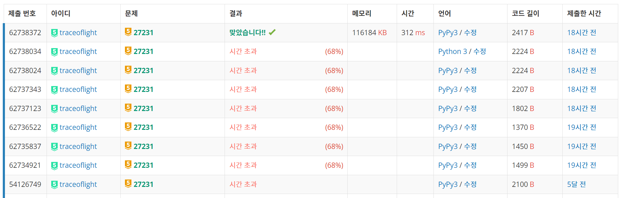 마지막 시도가 여러 번 있는 이유는 딱 한 가지 조건이 부족했기 때문인데 이 조건이 빠진다고 왜 시간초과를 받아버리는지는 아직 이유를 잘 모르겠다. 나중에 보충할 수 있는 이유라면 좋겠다. → 밑 내용을 정리하다가 생각났다. 역시 블로그 정리가 최고다!